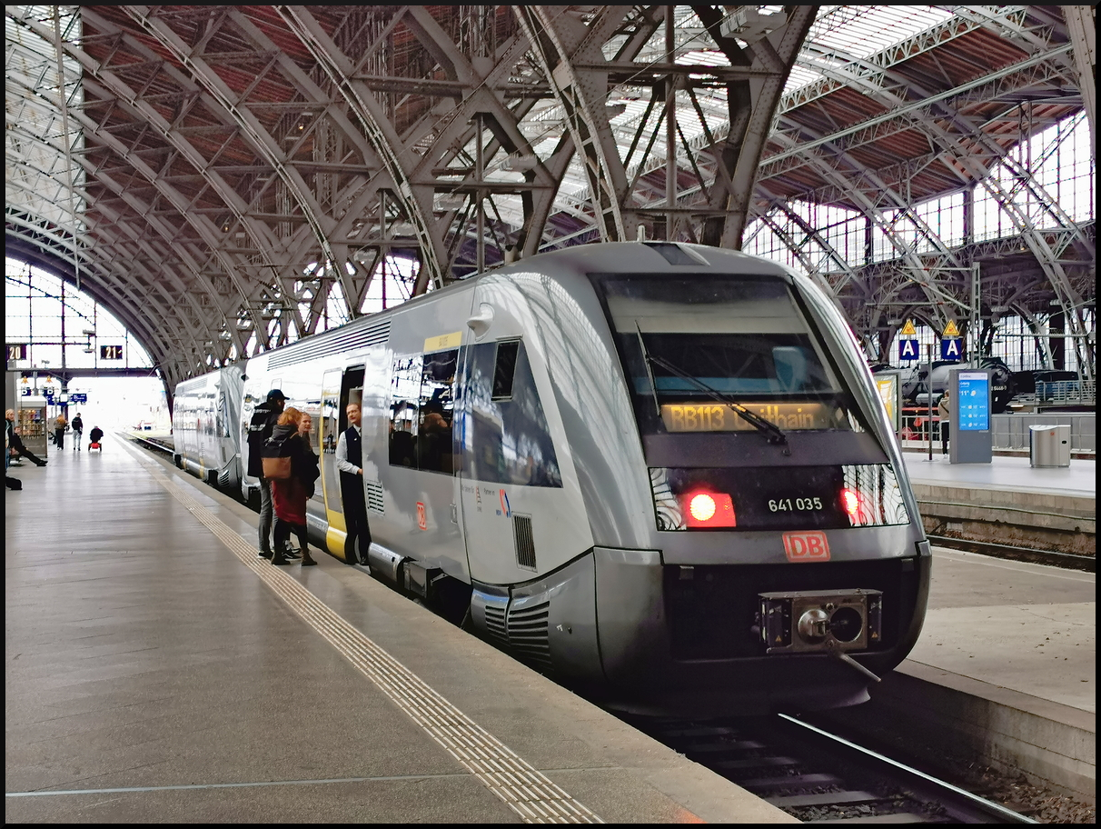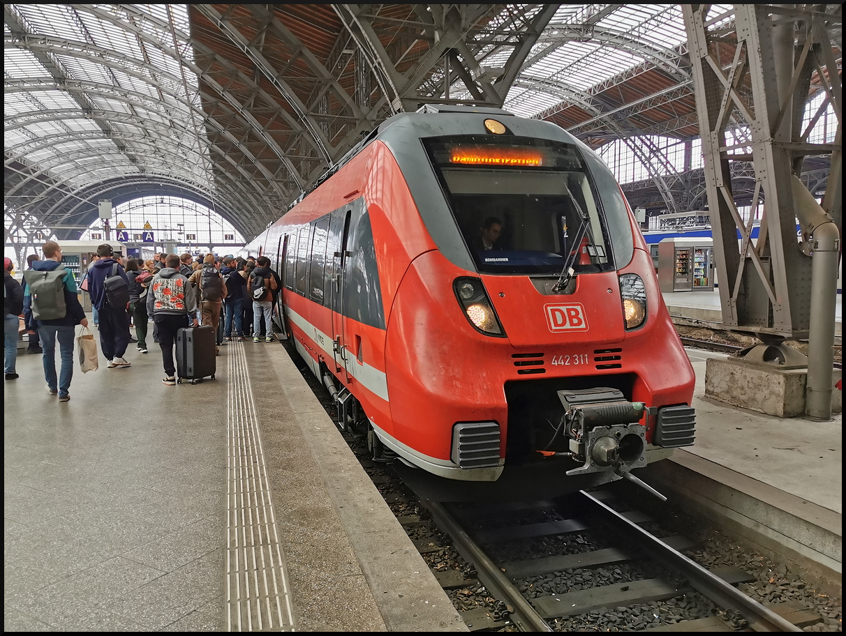 In den unteren Bahnsteig 2 vom Leipziger Hauptbahnhof ist gerade die S2 nach Leipzig-Stötteritz eingefahren. Unten links spiegelt sich das Signal das oben an der Decke angebracht ist. Diese Minisignale finden sich im City-Tunnel überall, Leipzig Hauptbahnhof, 20.03.2023 (94 80 1442 301-6 D-DB, DB Regio AG - S-Bahn Mitteldeutschland)