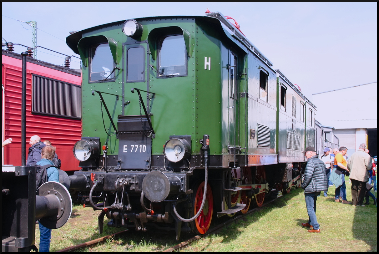 Die dreiteilige Gelenklok E 77 10 hatte während des 17. Dresdner Dampflokfest 100jährigen Geburtstag (nicht auf den den Tag festlegen :-) ) und konnte von den Besuchern genauer betrachtet werden. Die alte Dame stand mit anderen Loks an der Schiebebühne der IG Bw Dresden-Altstadt e.V. am 12.04.2025 auf dem Museumsgelände. Sie zeigte sich im museal aufgearbeiteten Zustand und obwohl sie betriebsfähig ist, hatte ihre letzte Verlängerung der HU 2012. Sie wird wohl nicht mehr fahren, was aufgrund ihrer konstruktionsbedingten schlechten Laufeigenschaften ohnehin selten erfolgte (NVR-Nummer 97 80 8177 010-6 D-IGDA).<br>