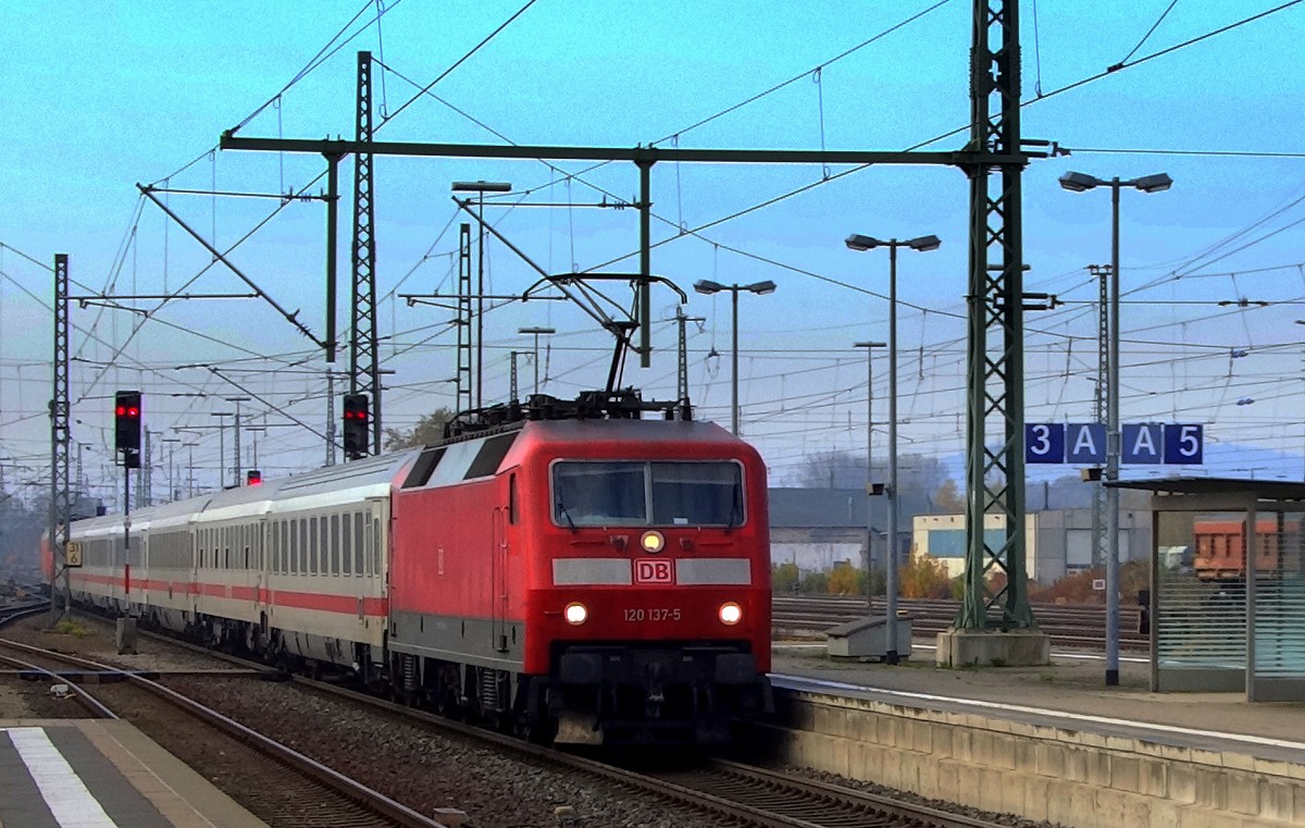 Ein Intercity mit zwei E-Loks der Baureihe 120 in Sandwichtraktion erreicht den Bahnhof Lichtenfels. Aufgenommen im November 2015.